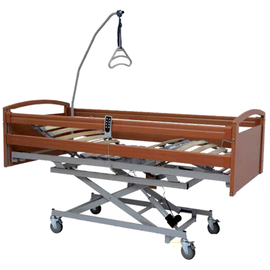 Il letto a pantografo Sax è dotato di struttura in legno e rete ortopedica con doghe in legno. La dotazione di serie prevede una coppia di sponde regolabili in altezza, blocchi ferma materasso e ruote piroettanti dotate di freno di stazionamento. La rete compie i classici movimenti di regolazione dell’angolo dello schienale e della zona cosce/piedi ed è regolabile in altezza parallelamente a terra, tramite il meccanismo a pantografo. Per garantire la sicurezza dell’utilizzatore, il telecomando può essere azionato solo previa attivazione del dispositivo Nurse Lock, tramite apposita chiavetta, da parte del caregiver. Il letto viene fornito di serie comprensivo di un triangolo solleva malati conforme alla normativa EN 60601-1. Portata: 135 kg. Carico massimo di sicuro utilizzo: 180 kg.